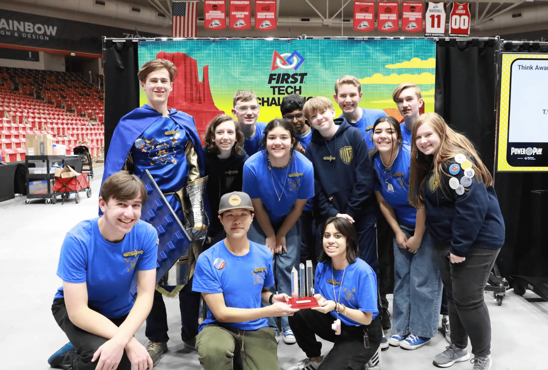 Hi! We are the Mecha Knights, Team 16028. We are based in Provo, Utah. We currently have 13 members, 2 main coaches, and 3 mentors that come frequently, among others. We began as a competition team in 2019, under the name of Radioactive Refrigerators Sold Separately (odd name, we know). We did a complete rebranding last year, changing our name to the Mecha Knights. This year, we continue to work on strengthening our branding.